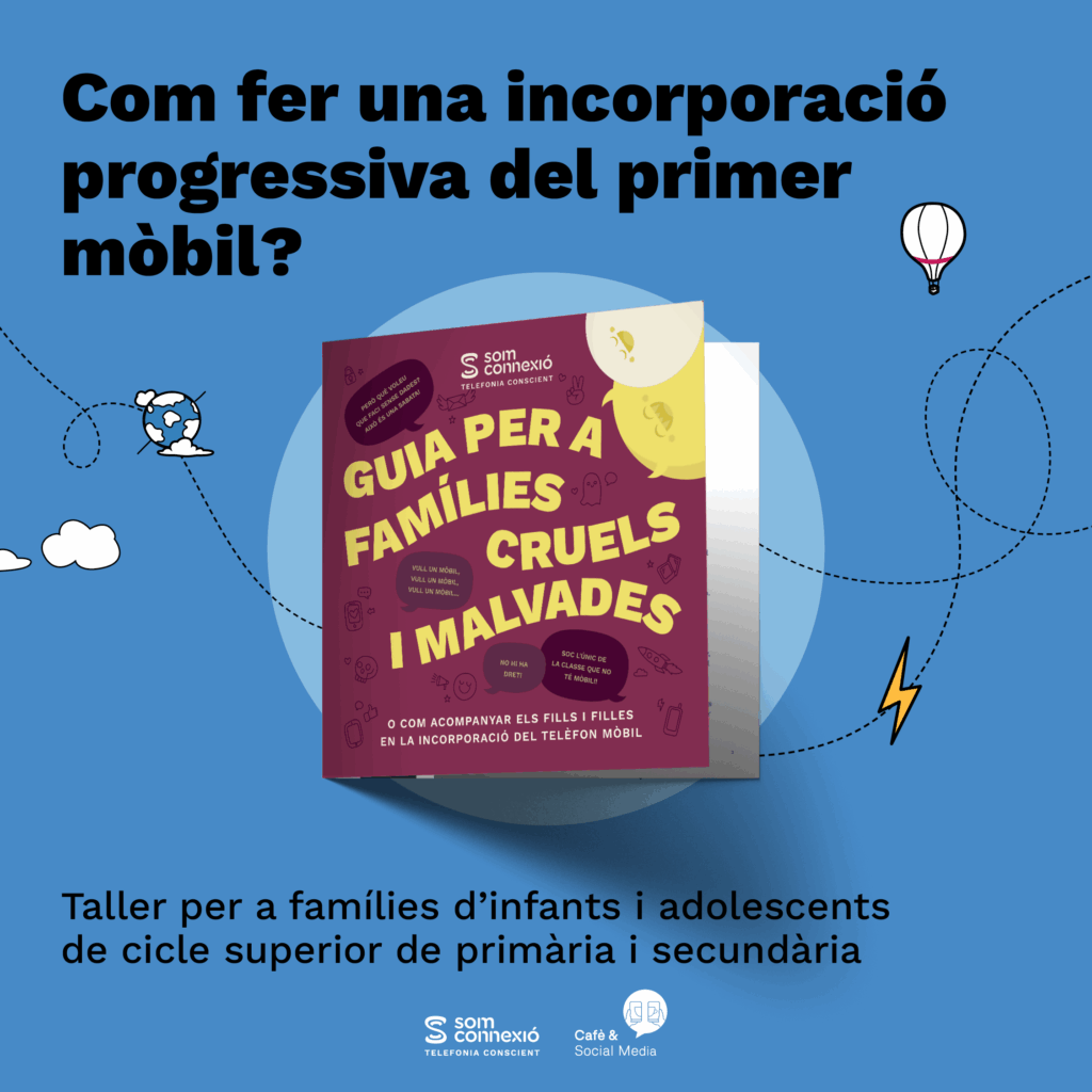 Es tracta d’un taller adreçat a famílies amb infants i preadolescents de cicle superior de primària i de secundària. L’objectiu és treballar in situ els continguts de la guia i oferir eines i reflexions per introduir el mòbil de manera progressiva. Amb una metodologia participativa, es treballa la manera de com arribar a un pacte d’ús i poder gestionar els conflictes que es derivin de l’ús de les pantalles de manera assertiva. Tota la informació addicional del taller està detallada en el seu fulletó.