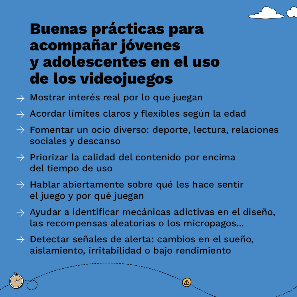 El creador de Crianza Digital considera que hay que respetar los videojuegos como una afición, “ni mejor ni peor que otros productos culturales, con una aproximación de interés genuino para entender sus riesgos y oportunidades”. Recomienda también “no infantilizar los videojuegos ni sostener un discurso de que son una pérdida de tiempo, puesto que no todo tiene que ser tiempo productivo y menos en el caso de un menor”.