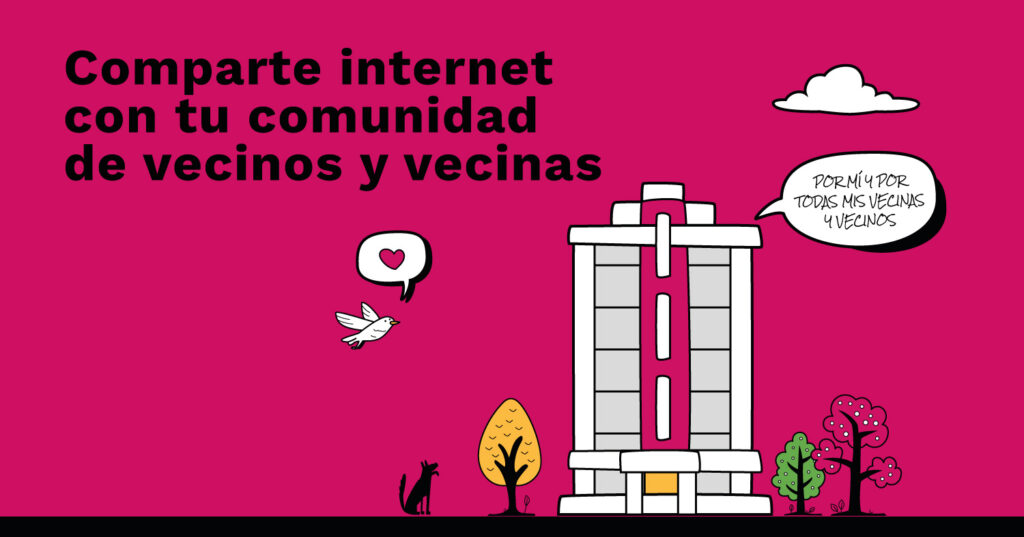El internet comunitario se explica a sí mismo: acceder a la red de forma conjunta a las comunidades de vecinas y vecinos. ¿Cómo? Construyendo una única infraestructura, que sea común, que sustituya las conexiones particulares. Así, la comunidad comparte una única conexión a Internet con una cuota mensual más económica para cada una de las viviendas del edificio y zonas comunes.